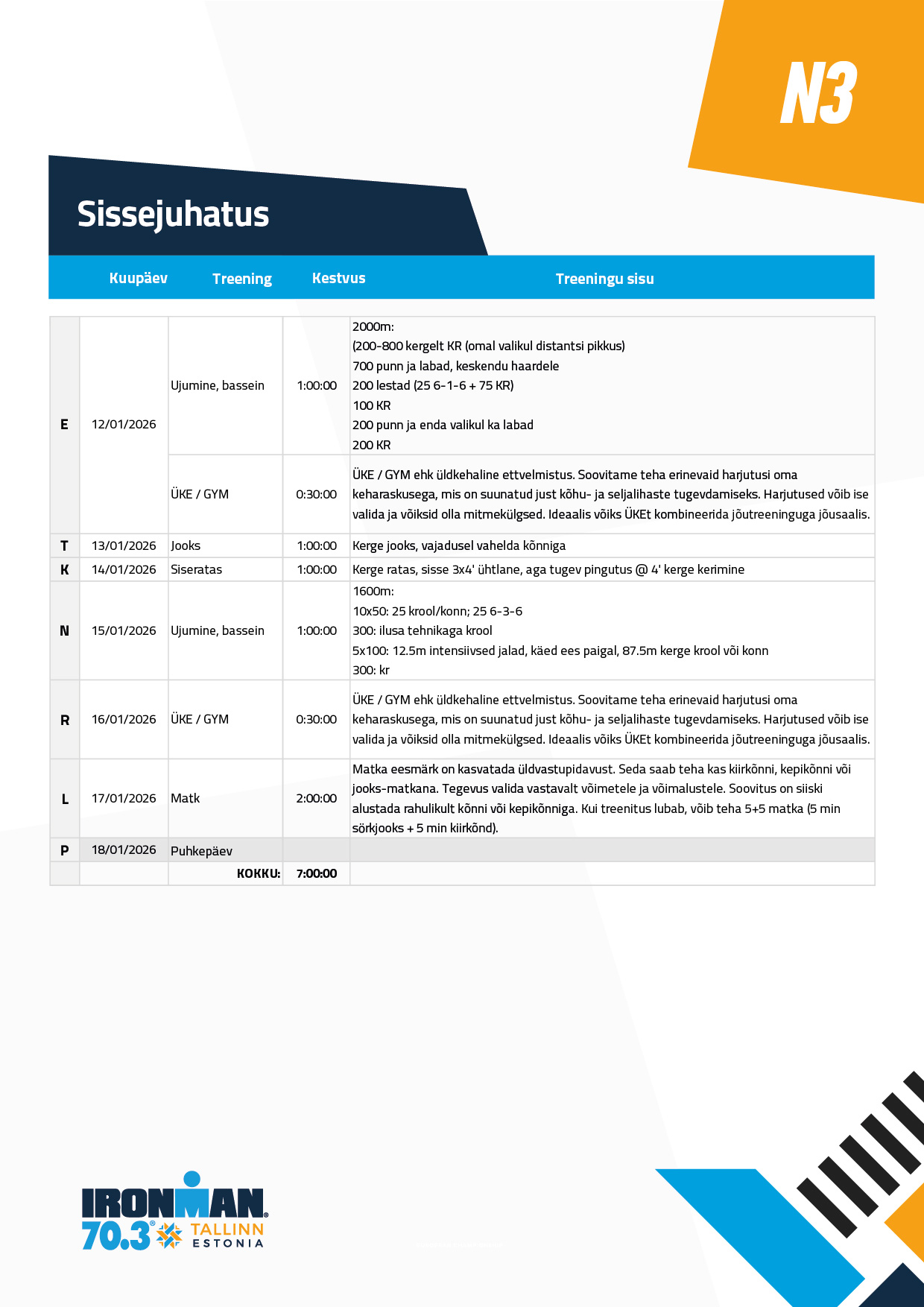 Ujumine ei ole pikem, kui tund. Ja võib ka lühem olla. Põhiosa on keskel ja keskendu selle ära tegemisele. Soojendus ja lõdvestus võivad vastavalt lühemad olla. Ujumistehnikad leiad enamuses siit: https://www.youtube.com/playlist?list=PLYcon0_LG98B3sqLTSWzy7DOV7aJkZ8R_