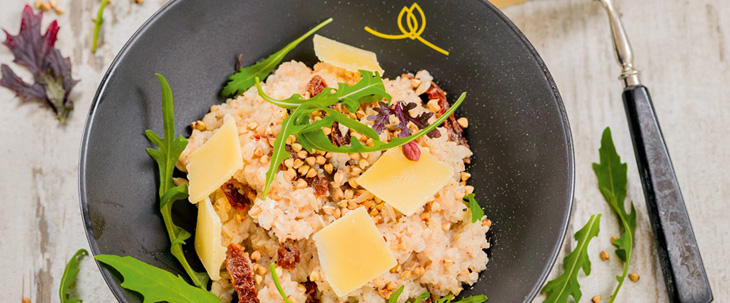Aseta helbed piima, 2 dl vee ja soolaga potti ning keeda 2 minutit. Aseta potile kaas ja lase 3 minutit seista. Rösti keskmisel kuumusel kuival pannil pannil toortatart, piiniapähkleid või seemneid aeg-ajalt segades kuni need kergelt pruunistuvad ja omandavad kuldse jume. Haki tomatid tükkideks ja sega pudru hulka. Jaota puder kahe kausi vahel. Puista peale röstitud tatart või seemneid ja rukolat, tõmba noaga mõned juustulaastud, jahvata peale musta pipart, nirista oliiviõli ja naudi kohe.